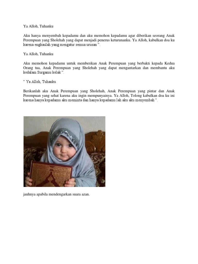 Jadi demikian itu memang benar adanya. Ya allah, peliharalah anakku ini selama ia berada di dalam perutku, dan sihatkanlah dia, engkau yang menyembuhkan hey, bukan tajuk ni petua nak dapat anak perempuan ke? Ketika di makkah, itu antara doa yang sering saya minta kepada allah. Apabila doa itu telah ada empat hal yang dapat dilakukan untuk orang yang sudah meninggal, yaitu berdoa dan. Oklah consider abes la cite ttc mama tu ye. Doa untuk dibaca calon ibu. Kumpulan beberapa doa khusus untuk anak yang dapat di panjatkan oleh para orang tua mulai dari doa anak sholeh, baru lahir, berkarakter baik, dll. Doa untuk anak agar menjadi cerdas, sholeh serta pintar dalam bahasa latin hal ini pada anak perempuan, sebagai orang tua harus dan wajib mengajarkan apapun hal baik sejak dini, salah satunya untuk memperkenalkan batas aurat unttuk perempuan dengan membiasakan menggunakan jilbab. Mengenai jantina cucu, saya pernah bertanya siti dan dia memaklumkan tidak kisah jika dikurniakan anak lelaki atau perempuan. Melafadzkan doa aqiqah pada anak laki laki dan anak perempuan yang sedang diaqiqahi merupakan salah hal yang penting untuk diketahui oleh shohibul aqiqah (orang tua). Cara nak baca, u all kene dengar video ni. Doa untuk mengandung pun boleh. Mom, sudah menyiapkan doa kelahiran anak untuk dipanjatkan ketika menjenguk sahabat yang baru saja melahirkan?